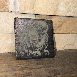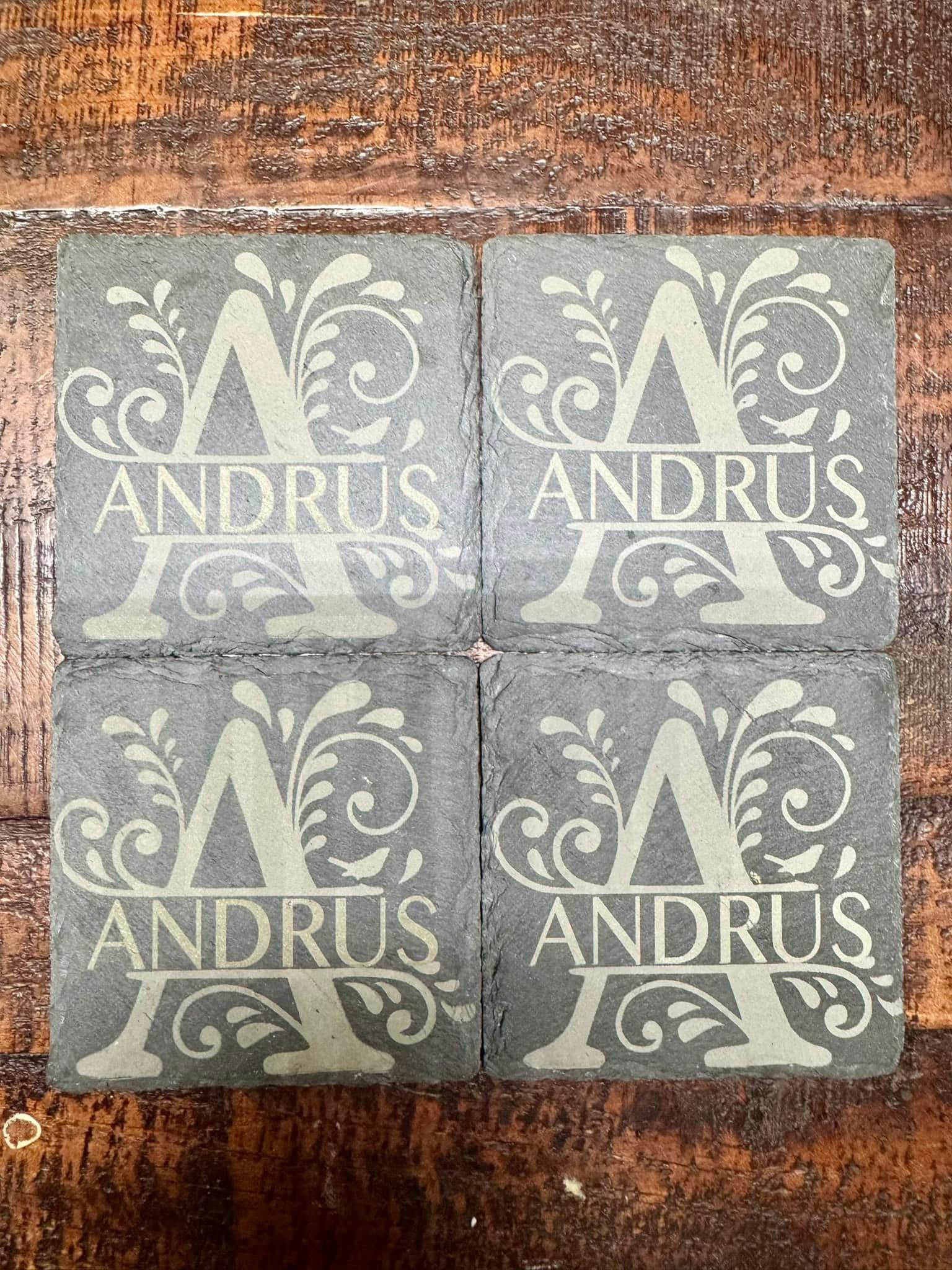 A set of four (4) slate coasters, either square or circular, are customizable by laser engraving as we have hundreds of SVG files of many different types.